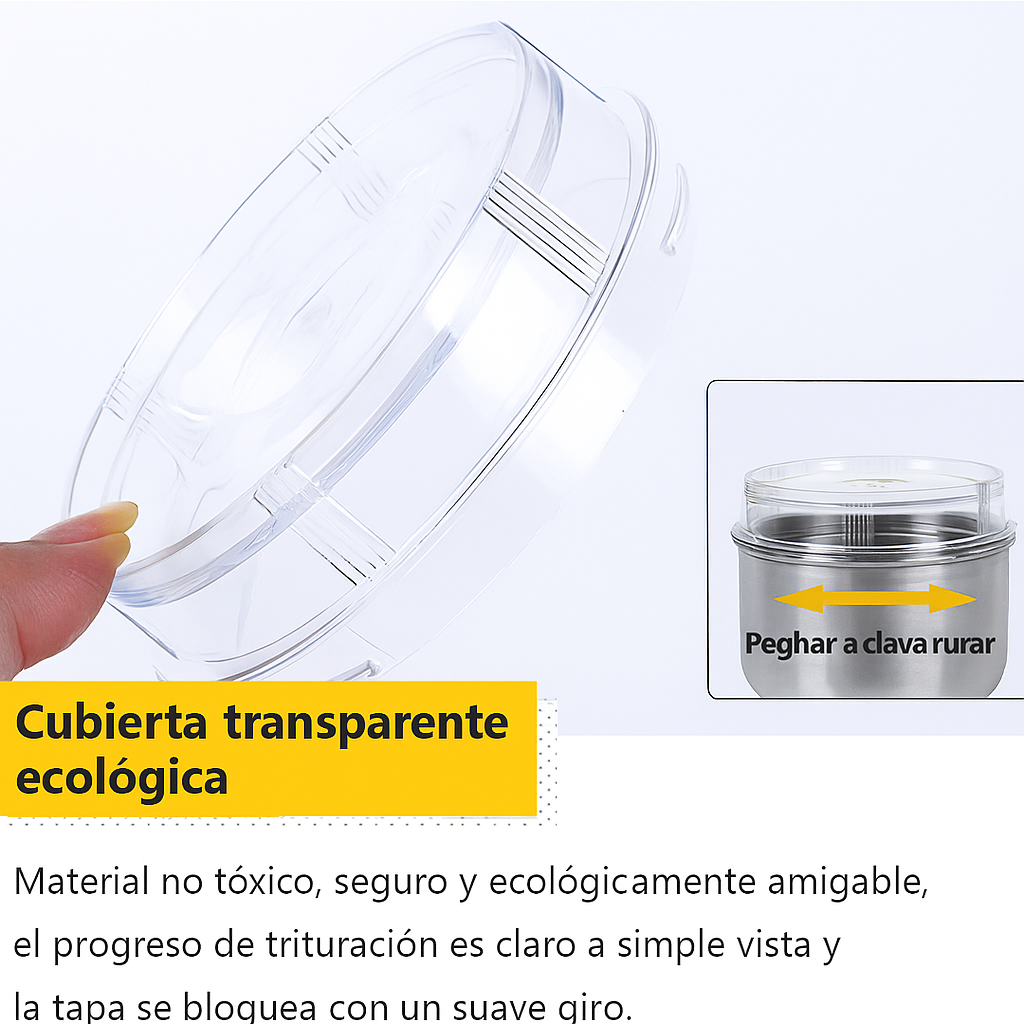 Cubierta transparente que permite observar el proceso de molienda y controlar el grosor del polvo.